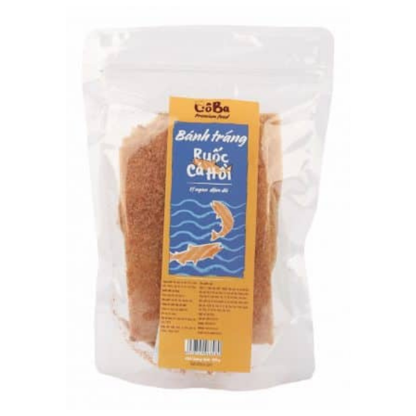 Nếu bạn là một trong những người có sở thích và đam mê với cá hồi, thì đây là món ăn vặt thỏa mãn bạn khi cá hồi được kết hợp với bánh tráng truyền thống. Bánh tráng cá hồi (bánh tráng ruốc cá hồi) Cô Ba được làm bởi các thành phần như bột gạo, mắm ruốc, đường, ớt, cá hồi, ruốc. Batrafoco đã hòa quyện tất cả nguyên liệu theo một tỉ lệ nhất định và đưa tới cho bạn một sản phẩm cực kỳ hấp dẫn.
