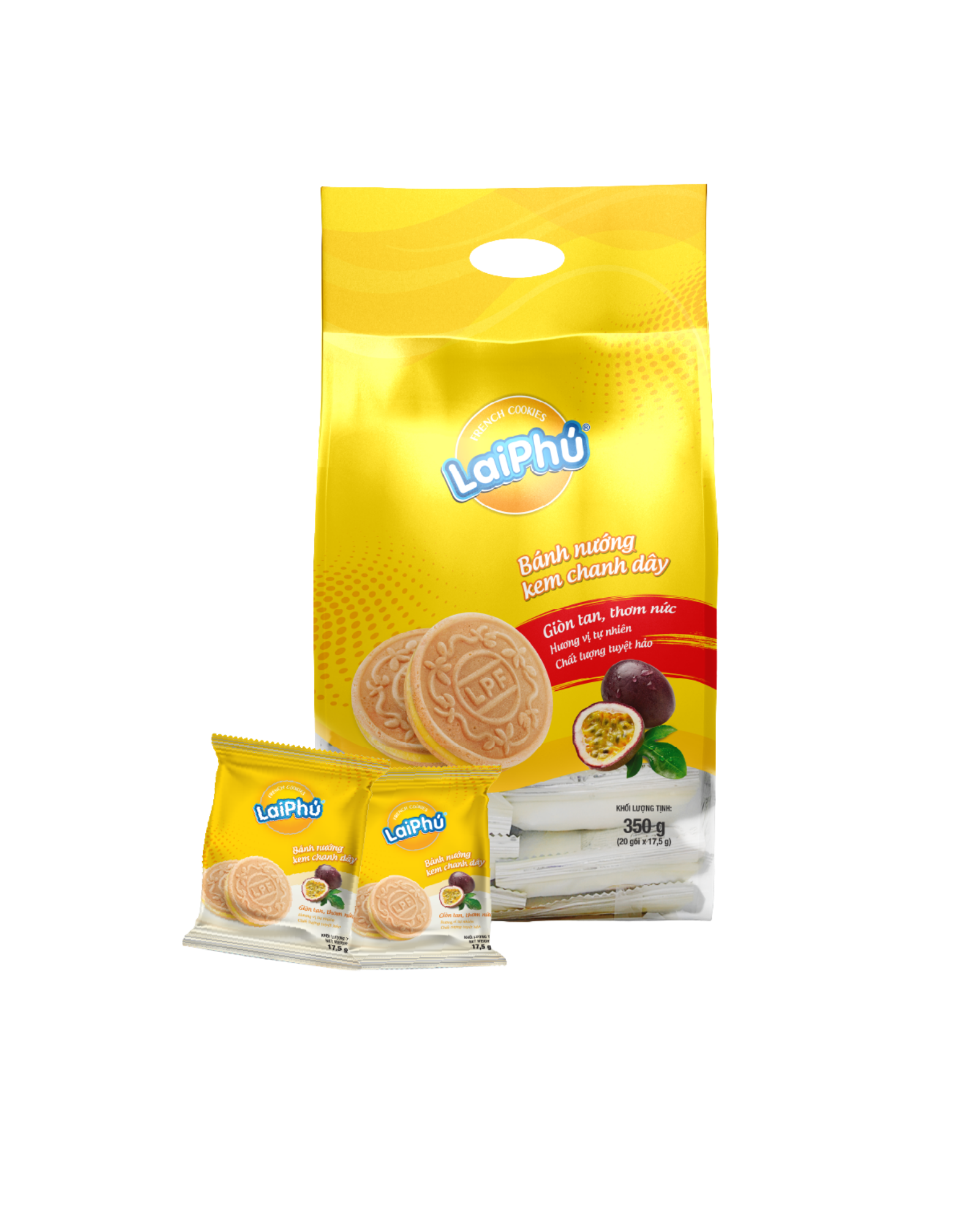 Combining a crispy cookie shell made from premium wheat flour with a vibrant sweet-and-tangy passion fruit cream filling, Lai Phú Passion Fruit Cream Cookies 350g offer the perfect balance between the distinctive tartness of passion fruit and a thin, crunchy cookie base—delivering a delightful taste experience.