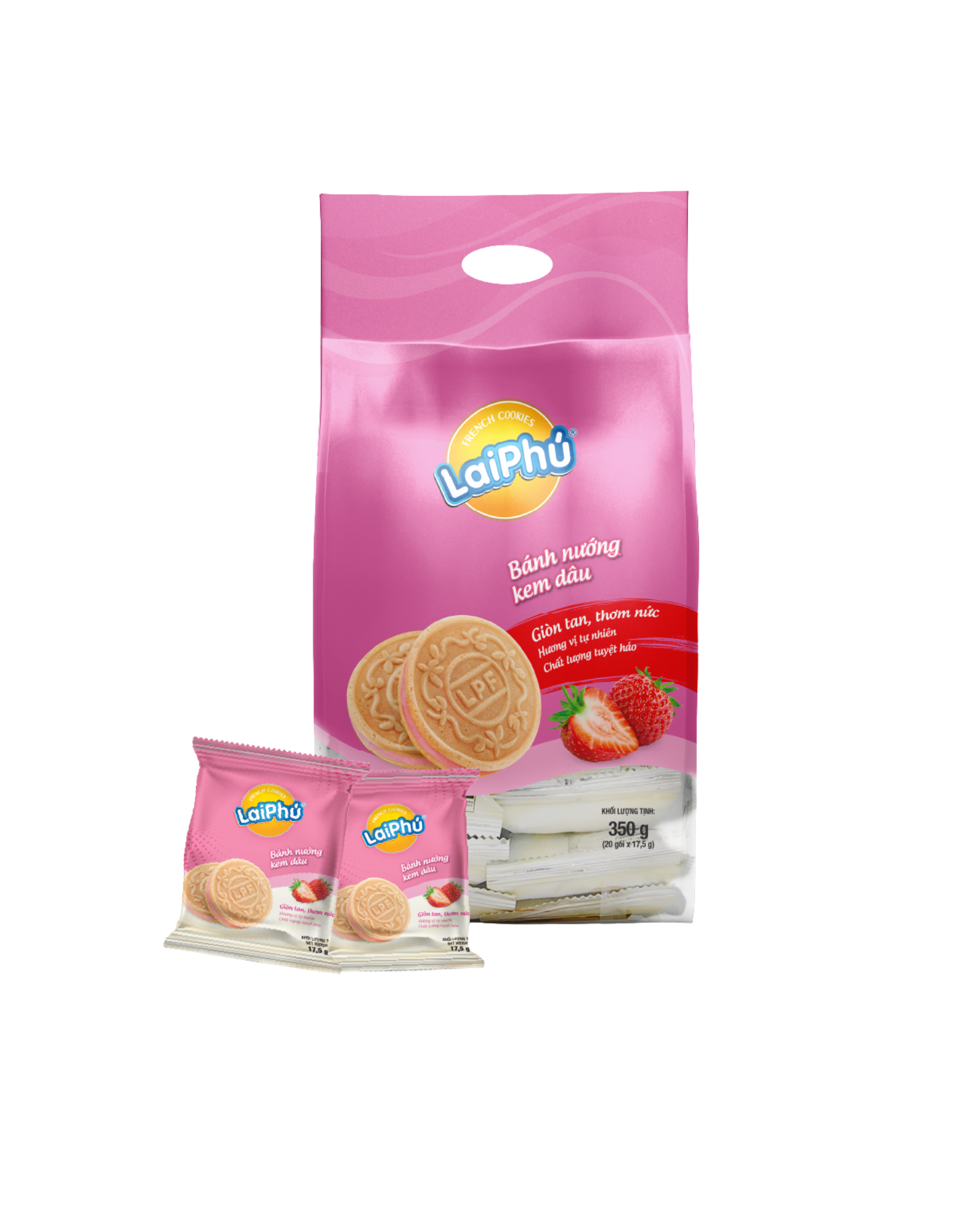 Combining a crispy cookie shell made from premium wheat flour with a smooth, sweet-and-tangy strawberry cream filling, Lai Phú Strawberry Cream Cookies 350g deliver a perfect balance between the original strawberry flavor and a thin, crunchy cookie base—creating a familiar yet irresistibly delicious taste experience.