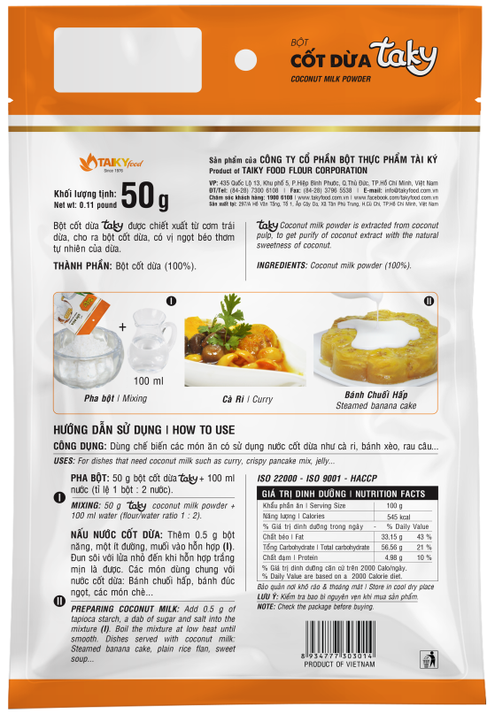PHA BỘT: 50g Bột cốt dừa TAKY+ 100ml nước (tỷ lệ 1 bột : 2 nước)