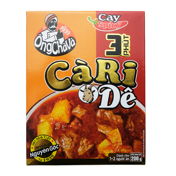 Thịt dê (25%), nước, khoai lang, bột sữa dừa, bột kem sữa, hành tây, cà rốt, khoai tây, dầu nành tinh luyện, đường, tỏi, bột nghệ, muối, ớt, chất làm dày (1422), hạt điều màu, tiểu hồi, bột ngò, đinh hương, quế, hạt thì là, sả, đại hồi, gừng, chất điều chỉnh độ acid (330), lá cà ri (0.02%), chất điều vị (621, 631, 627), chiết xuất nấm men.